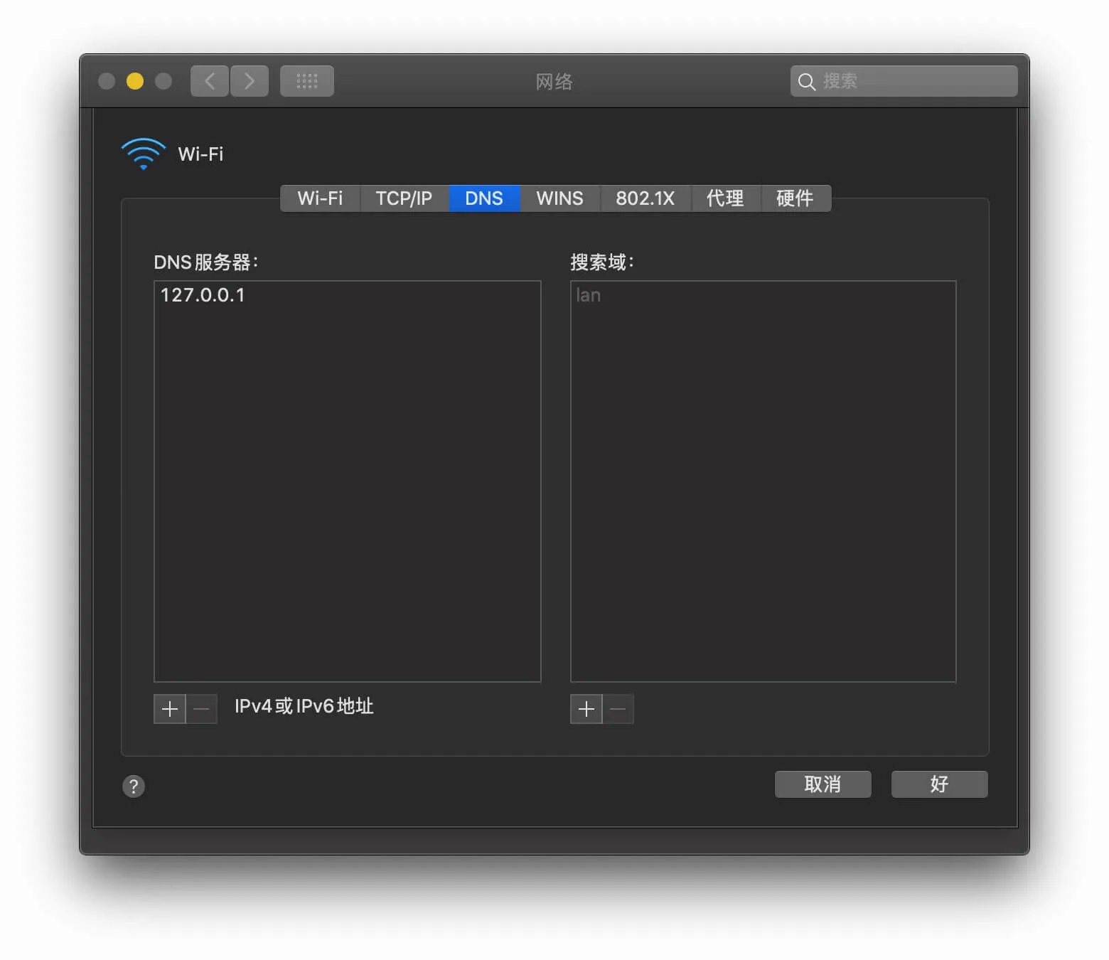之后再把网络设置里的DNS地址修改为127.0.0.1,应用之后就可以享受无污染的DNS了。