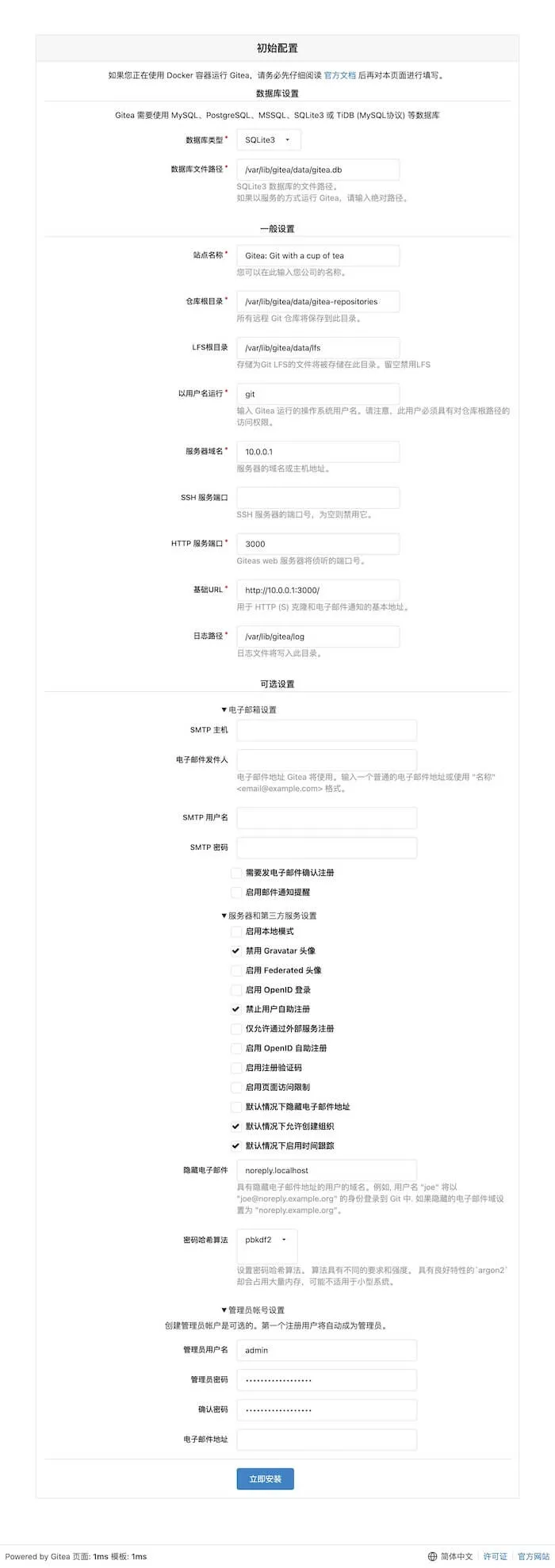 然后服务应该就会在3000端口运行了(使用服务运行默认是在3000端口,如果需要修改端口,要在服务配置的命令中加上--install-port 端口号),从浏览器访问IP:3000来打开安装页面。