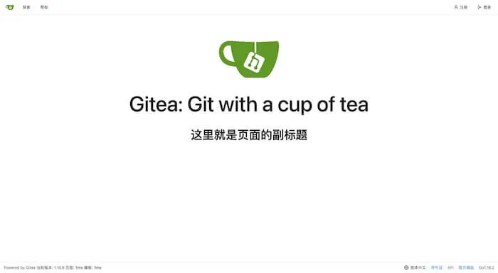 在默认的首页样式中,我们可以看到除了我们的网站名字以外,还有一些默认的文字和图案内容。比如一款极易搭建的自助 Git 服务,易安装,跨平台,轻量级,开源化等等。想要修改这些内容,你需要这样做。