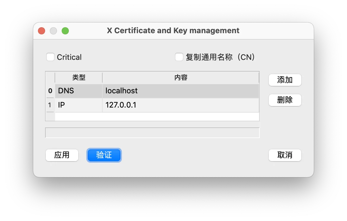 之后点击[X509v3 Subject Alternative Name]的编辑,在弹出框中添加证书对应DNS和IP的设置,点击验证对配置进行检查,之后点击应用。