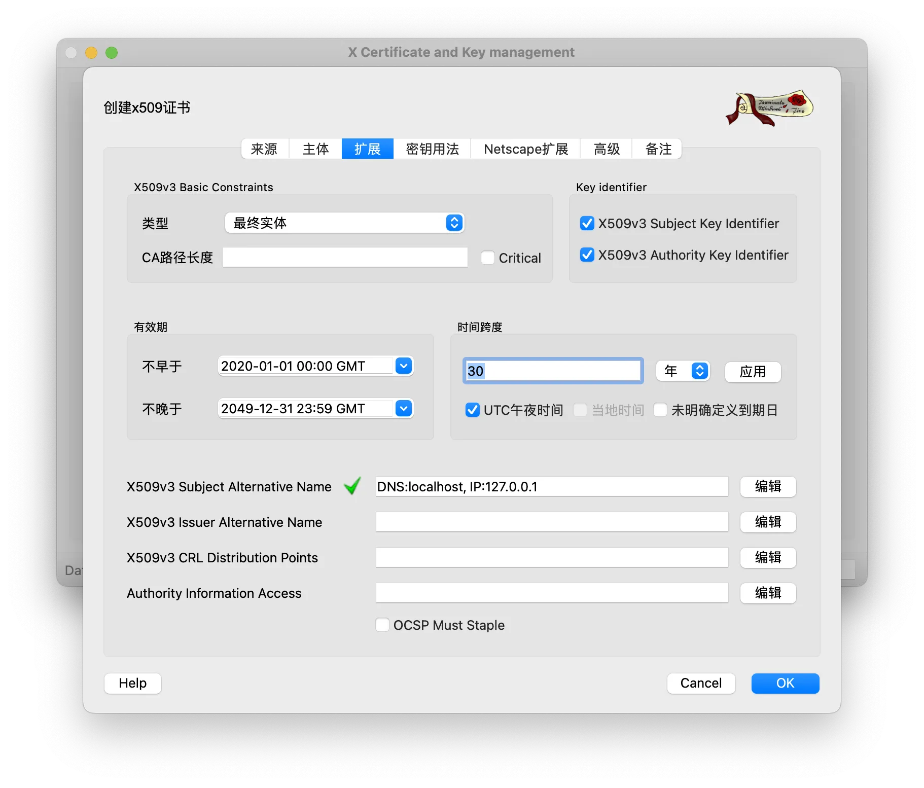 在[扩展]选项卡,[类型]选择最终实体,勾选X509v3 Subject Key Identifier和X509v3 Authority Key Identifier,之后根据个人需求输入证书的有效期。