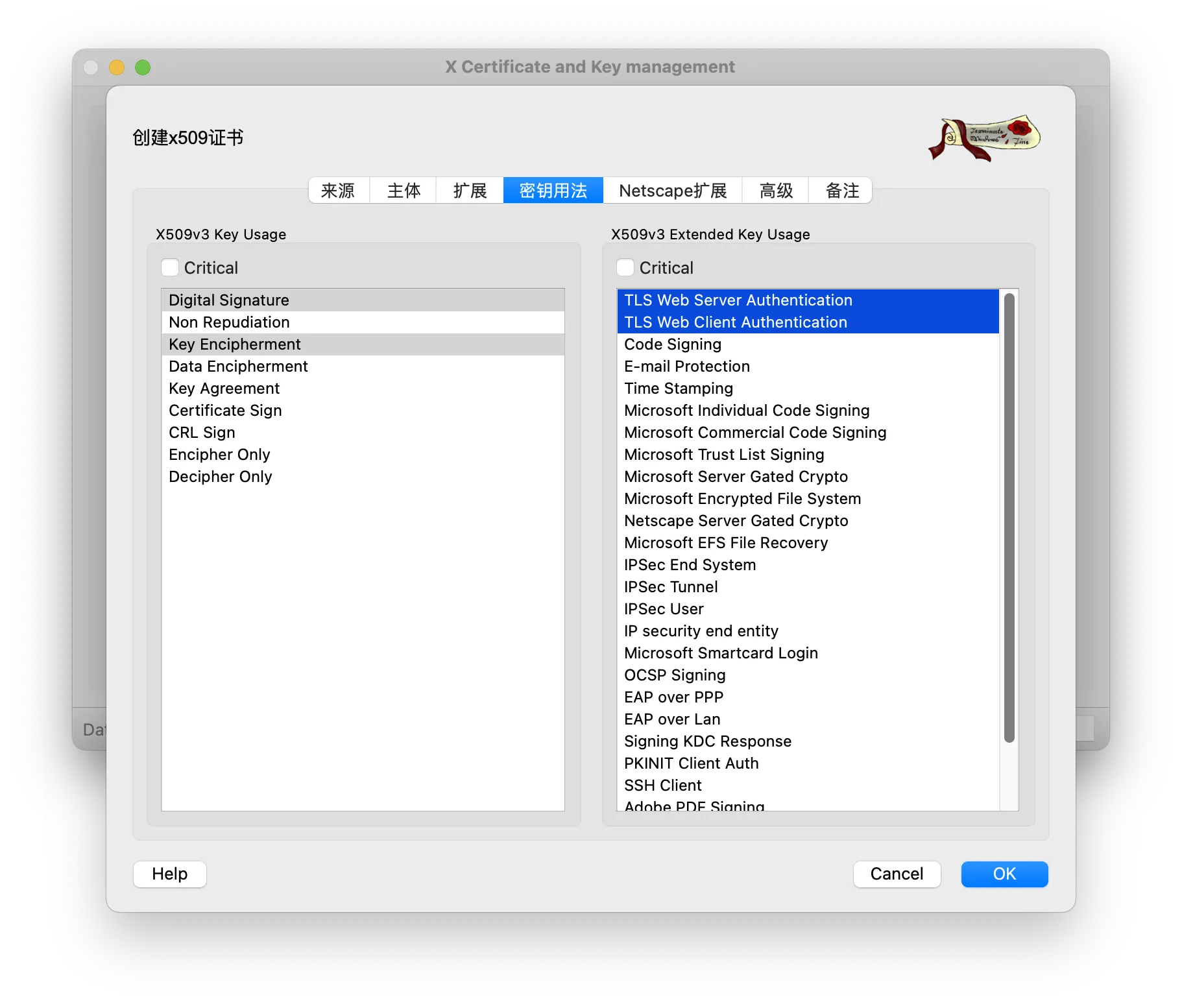 在[密钥算法]选项卡,在[X509v3 Key Usage]选择Digital Signature和Key Encipherment,在[X509v3 Extended Key Usage]选择TLS Web Server Authentication和TLS Web Client Authentication。