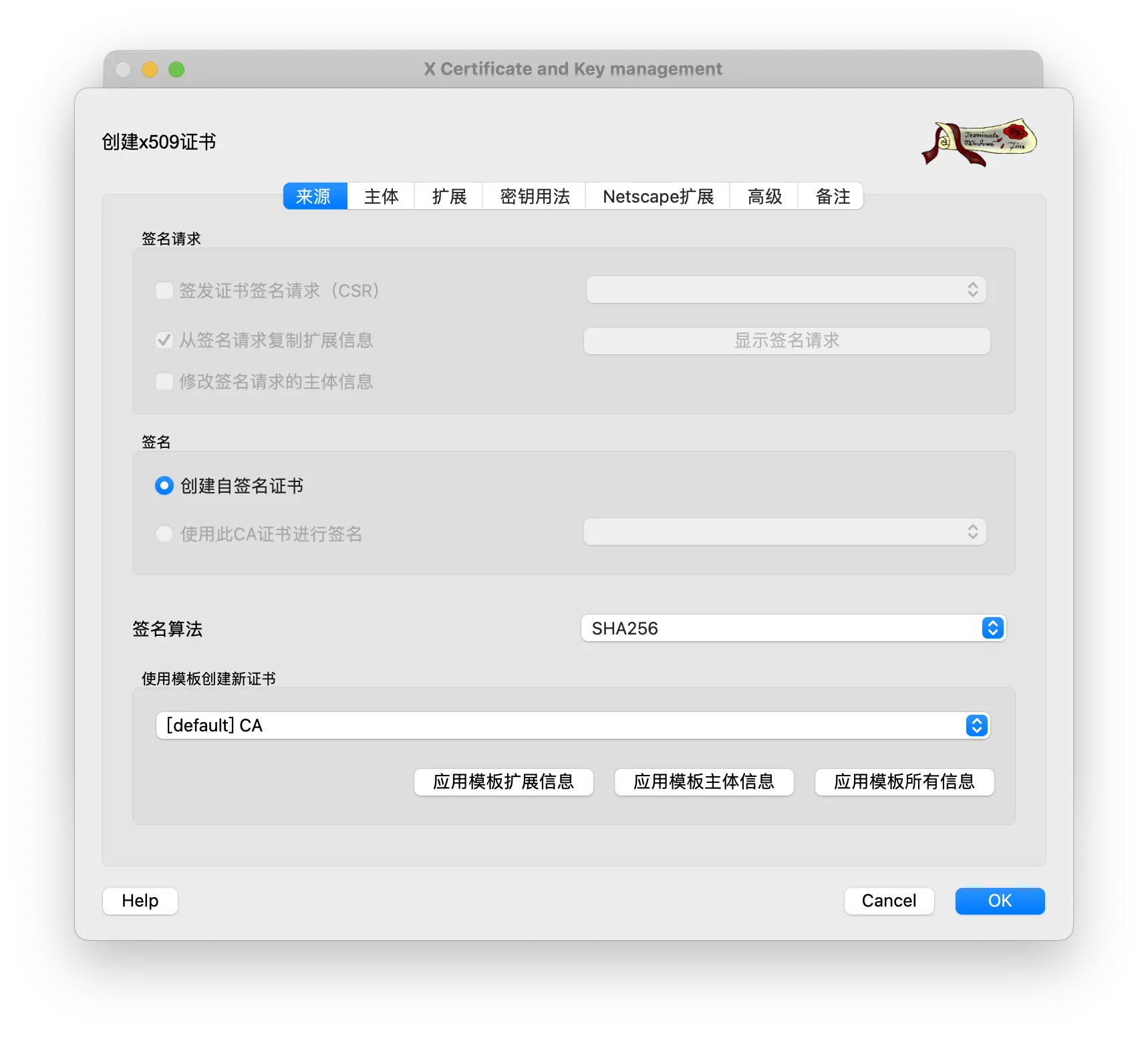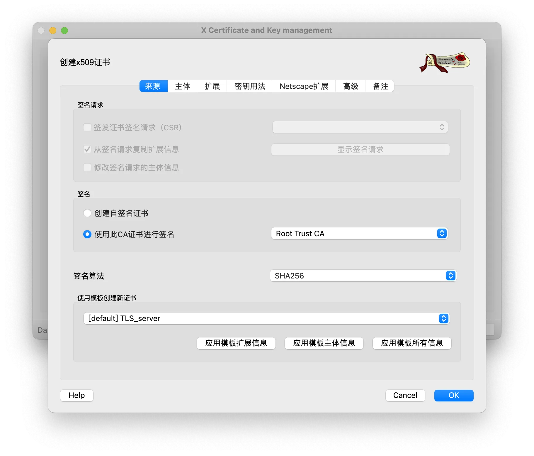 在[来源]选项卡,[使用此CA证书进行签名]选择上一部创建的根证书,[使用模板创建新证书]选择TLS_server。