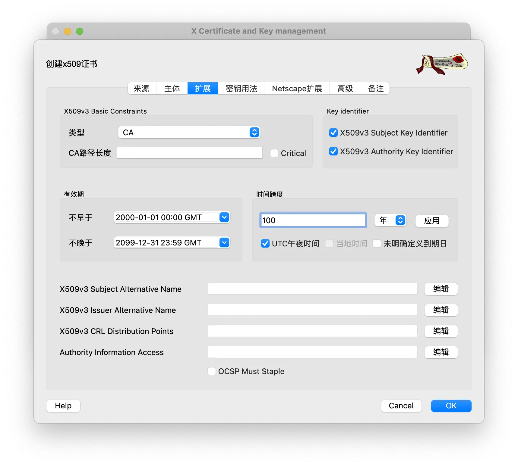 在[扩展]选项卡,[类型]选择CA,勾选X509v3 Subject Key Identifier和X509v3 Authority Key Identifier,之后根据个人需求输入证书的有效期。