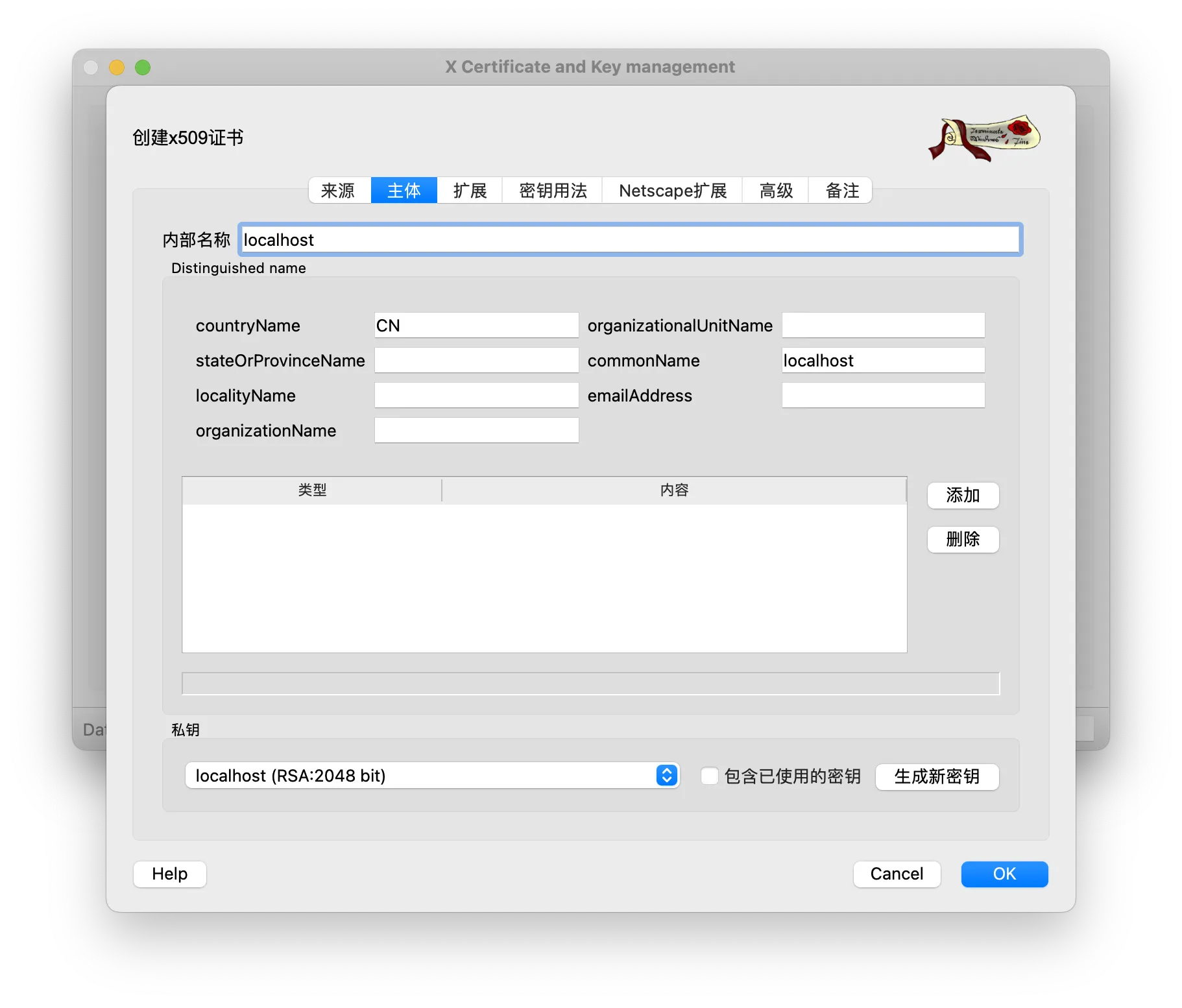 在[主体]选项卡,根据个人需求输入证书的信息,[私钥]选择刚刚创建的密钥。