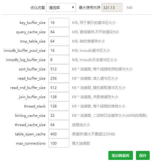 其实宝塔之所以不让小内存机器装MySQL5.7,其实也是因为这玩意内存占用是真的高,启动就占300M,一跑起来随便就五六百。不过咱们的网站需求并不高,所以完全可以降低点配置。